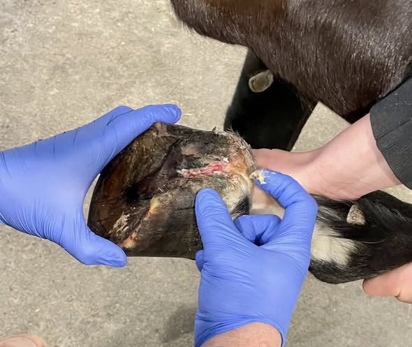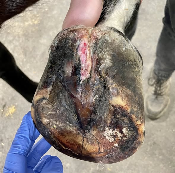 Foto 2: Derselbe Huf nach Entnahme einer Gewebeprobe. Die Probe wird u. a. in dem auch für uns tätigen immunhistologischen Labor in Berlin auf Treponemen untersucht.