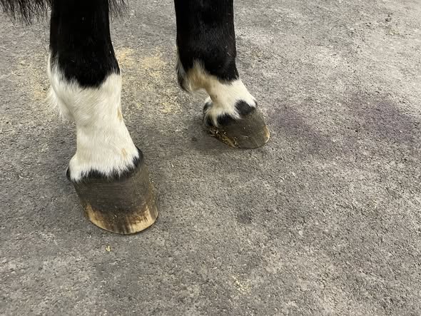 Foto 5: Defekte Glasurschicht, schwarze Verfärbung und, bei näherer Betrachtung, zahlreiche feine Risse in der Hufwand zeigen an, dass sich auch an den Hinterhufen Erreger in und unter der Wand eingenistet haben.