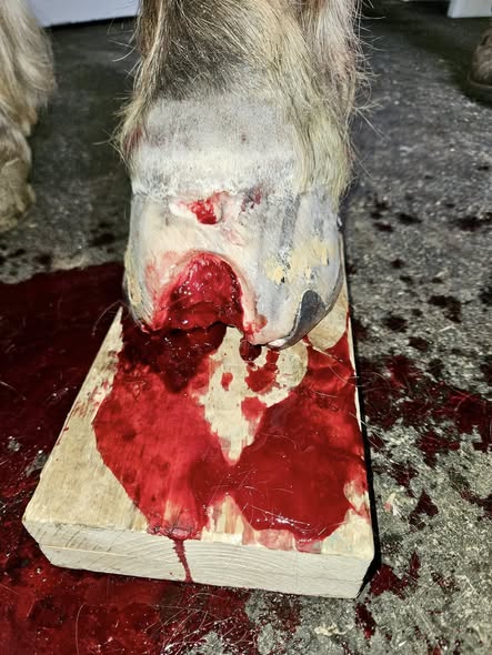 Patient aus einer bayerischen Pferdeklinik mit tiefer bakterieller Hufinfektion und fortschreitender Osteolyse (Knochenauflösung) des Hufbeins.