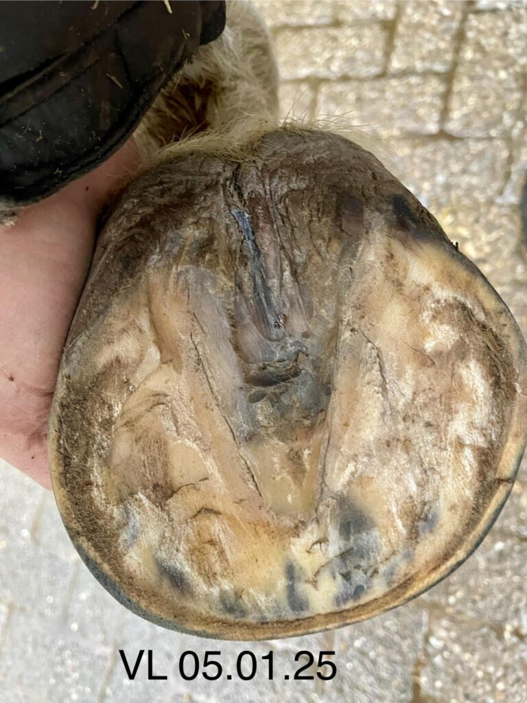 Regeneration eines tief infizierten Strahls innerhalb weniger Wochen. Da alle Strähle des Pferdes (Springpferd, Schimmelstute aus vorherigen Posts) sehr ähnlich aussahen, hier exemplarisch nur der Huf VL mit entsprechenden Daten.